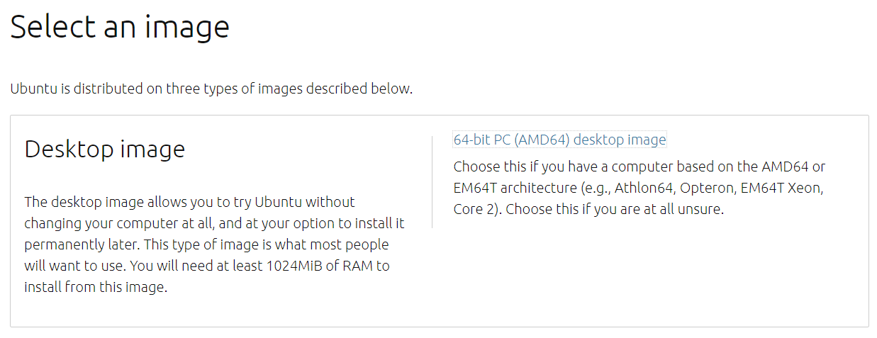 Select an image Ubuntu is distributed on three types of images described below. Desktop image The desktop image allows you to try Ubuntu without changing your computer at all, and at your option to install it permanently later. This type of image is what m