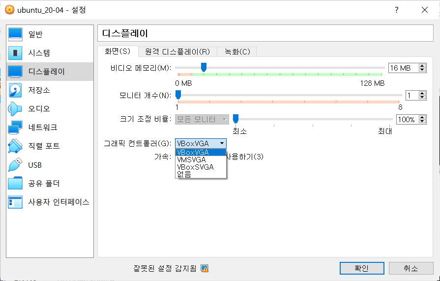 따라서 아래와 같이 설정 -> 디스플레이 -> 그래픽 컨트롤러 : VBoxVGA 로 바꿔준다.