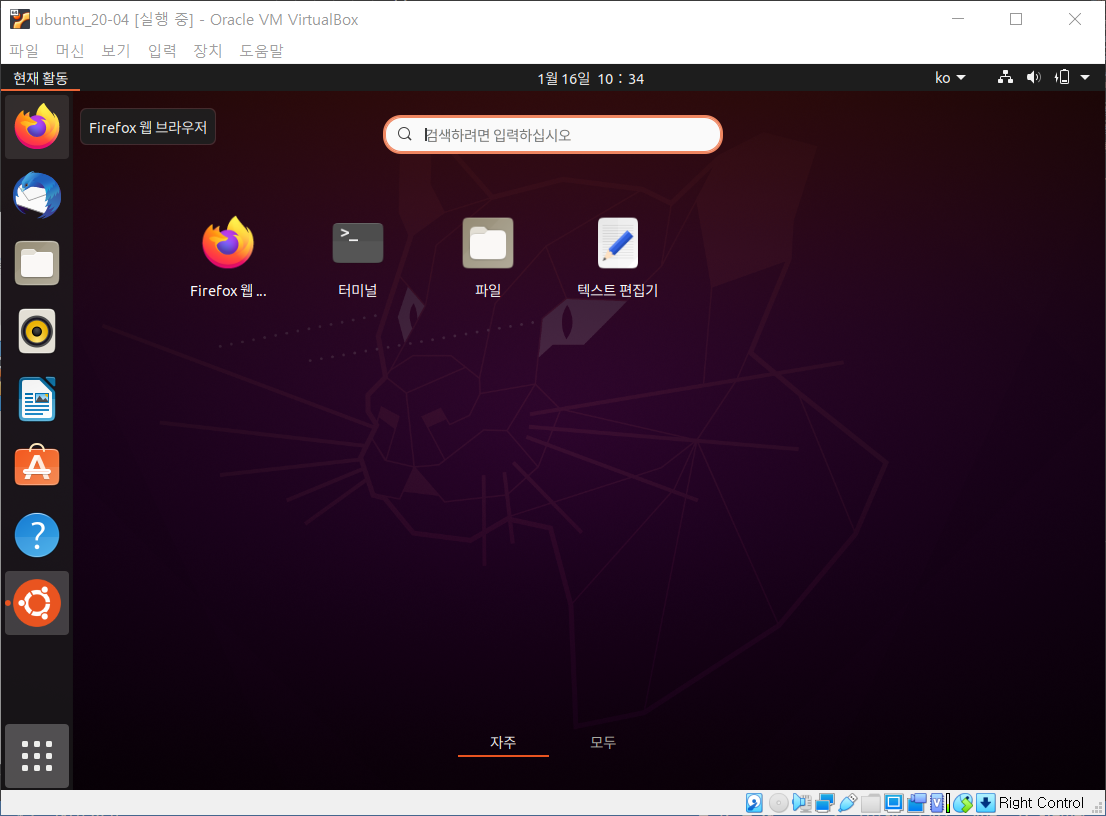 이쯤이면 Ubuntu 설치가 완료됐을 것이다! 이제 아래처럼 왼쪽의 메뉴에서 맨 아래 '프로그램'을 누르고, 터미널에 들어가보자. (Windows의 cmd와 같음)