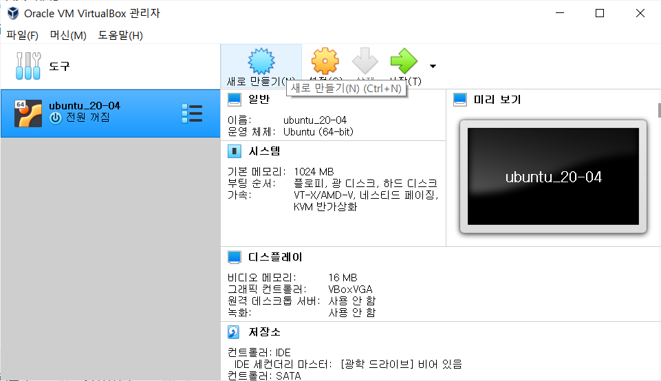 VirtulBox 설치가 끝났으면 아래와 같은 관리자 창이 뜨는데, 여기서 새로 만들기 버튼을 눌러서 VM을 생성한다.