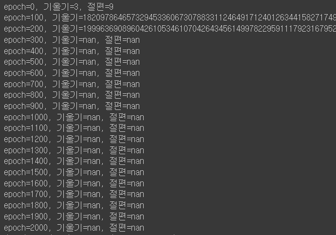 처음에 학습률을 0.3으로 설정했는데, 초기값만 멀쩡하고 그이후로 기울기와 절편값이 nan가 나와서 당황스러웠다,,