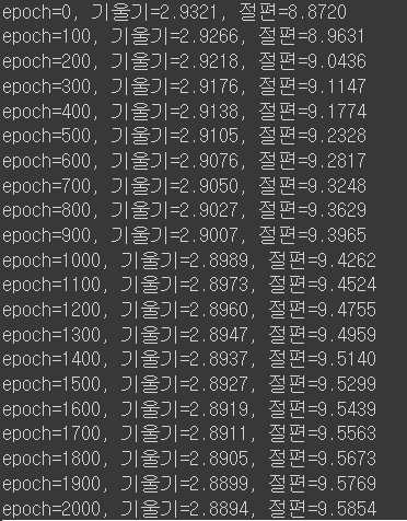 print("epoch=%.f, 기울기=%.04f, 절편=%.04f" %(i,a,b))