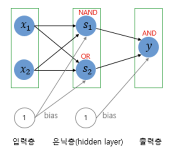 XOR 게이트는 기존의 AND, NAND, OR 게이트를 조합하면 만들 수 있음 => 층을 더 쌓기