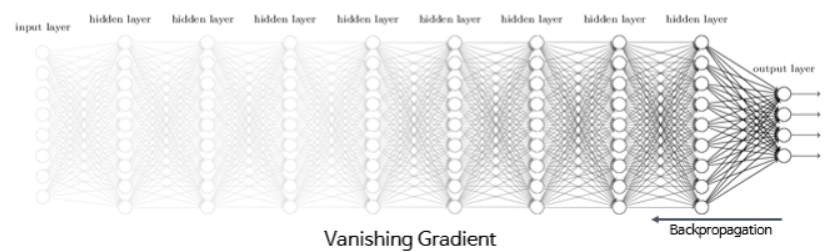 주황색 부분은 기울기를 계산하면 0에 가까운 아주 작은 값이 나옴. 그런데 역전파 과정에서 0에 가까운 아주 작은 기울기가 곱해지게 되면, 앞단에는 기울기가 잘 전달되지 않는 문제점