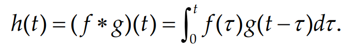 - 하나의 함수와 또 다른 함수를 반전 이동한 값을 곱한 다음, 구간에 대해 적분하여 새로운 함수를 구하는 수학 연산자 (라플라스 변환 계산을 용이하게 함.)